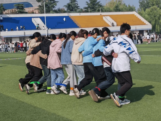十人九足环节中,相邻的人将腿用绳子绑在一起,喊出统一的口号来调整步伐:“左、右、左、右……”渐渐地,我们找到了节奏,成功跑到终点。每个人都在为团队的胜利贡献自己的力量。