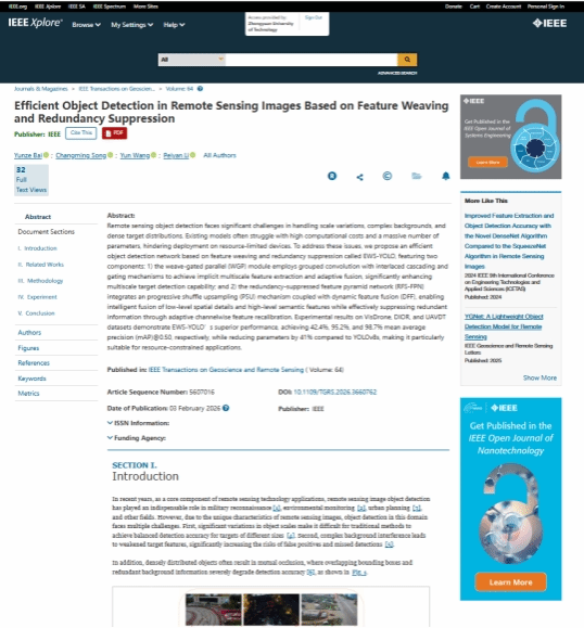 近日,性爱网 宋长明教授团队在地球科学和遥感图像处理领域的顶级期刊《IEEE Transactions on Geoscience and Remote Sensing》(中国科学院一区,影响因子8.6)上发表题为“Efficient Object Detection in Remote Sensing Images Based on Feature Weaving and Redundancy Suppression”的研究成果(论文doi:10.1109/TGRS.2026.3660762)。该论文以性爱网 为第一署名单位,论文通讯作者为研究生指导教师宋长明教授,2023级研究生白云泽为第一作者。