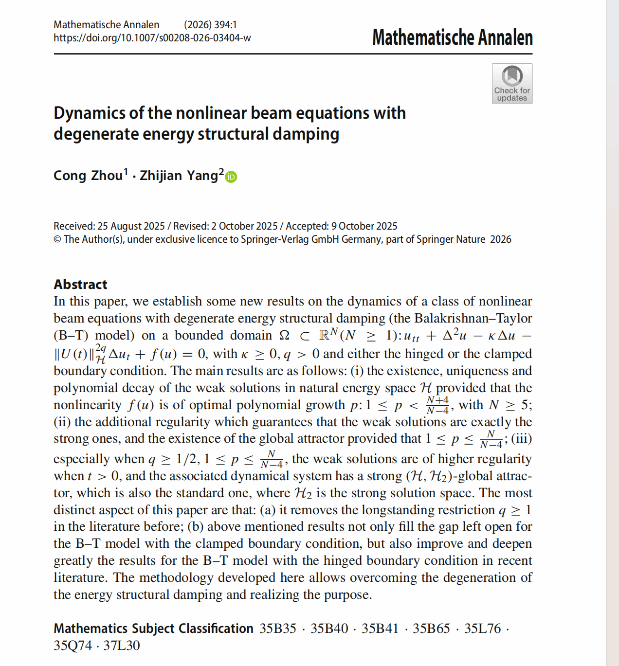 青年教师周聪博士与郑州大学杨志坚教授合作在国际著名数学期刊《Mathematische Annalen》(德国数学年刊)上发表了题为“Dynamics of the nonlinear beam equations with degenerate energy structural damping”的研究论文。 该期刊是1868年创办于德国的综合性数学期刊,致力于发表数学各领域具有突破性的重要成果,是数学界公认的国际著名期刊,有着非常高的学术影响力。著名数学家Klein、Hilbert曾先后担任该刊主编,著名物理学家Einstein也曾担任编委并在该刊发表过重要论文。