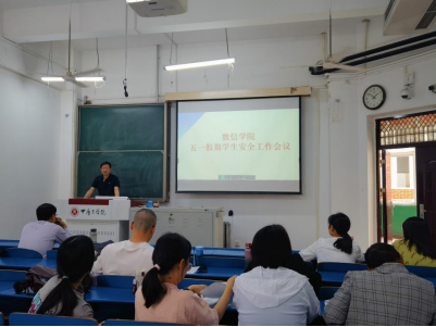 召开五一假期学生安全工作会议。全体班主任、辅导员参加。党总支副书记杨向宇主持会议。